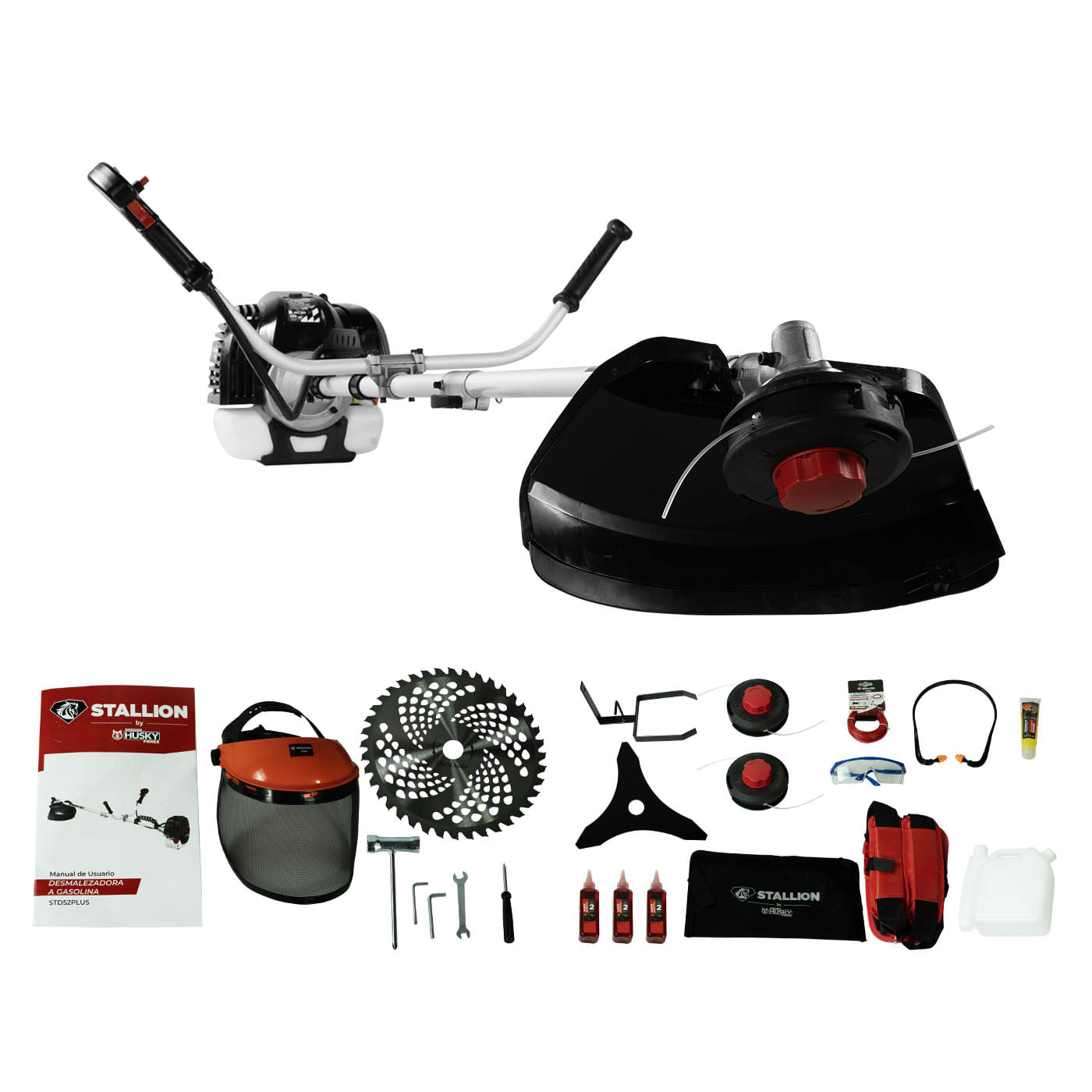 Incluye: 2 cabezales, careta con malla, kit de herramientas, arnes, disco, cuchilla 3 picos, aceite mineral, grasa lubricante, adaptador para cuchilla y cabezal, soporte para pared, hilo de nylon, proteccion auditiva, gafas de seguridad y recipiente de mezcla.