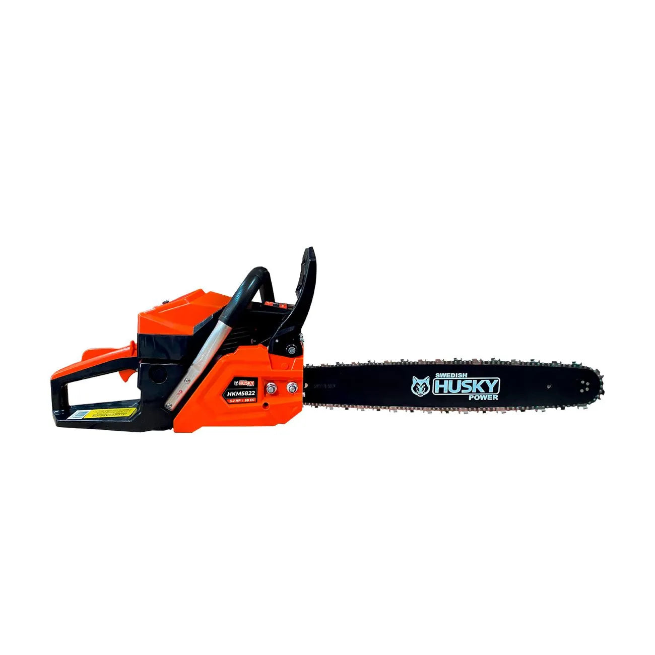 Motosierra semiprofesional de 22 pulgadas y con motor de gasolina de 2 tiempos marca SWEDISH HUSKY POWER. Potencia 3.2 hp.